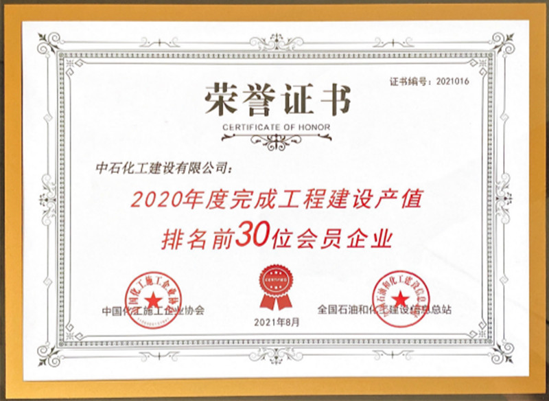 我公司在中國化工施工企業(yè)協(xié)會及全國石油和化工建設(shè)信息總站2020年度完成工程建設(shè)產(chǎn)值排名中位列第16名。