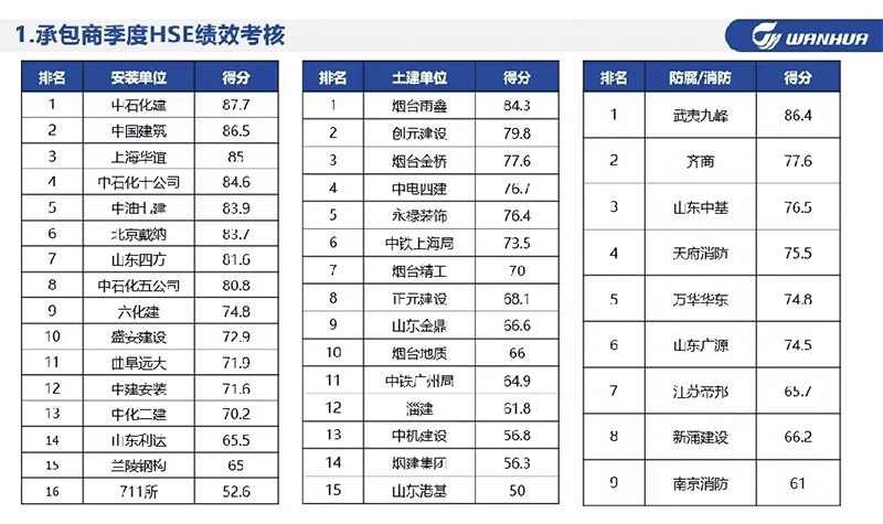 安全是工程建設(shè)永恒的主題。本項(xiàng)目HSE管理依規(guī)范而行,同時(shí)吸納萬(wàn)華集團(tuán)采用的杜邦安全管理體系的經(jīng)驗(yàn),并依據(jù)項(xiàng)目現(xiàn)場(chǎng)實(shí)際情況,形成了特有的管理模式,最終取得了驕人的成績(jī)。在整個(gè)萬(wàn)華幾十家施工單位中,我單位安全管理綜合打分排名一直是第一名、第二名!