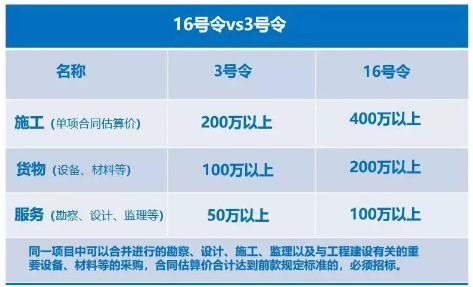 與原3號令相比提高了一倍。同時,取消了“單項合同估算價低于上述規(guī)定的標(biāo)準(zhǔn),但項目總投資在3000萬元人民幣以上”的規(guī)定。